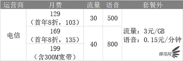 电信方面选择相对较少一些,包含129、169和199三个档位,其中129和169两档目前有首年8折的优惠,相当于每月仅需103元和135元,分别对应30GB国内流量、500分钟通话时长和40GB国内流量、800分钟通话时长。而199元套餐则除了拥有40GB国内流量和800分钟通话时长外,还拥有一条300M宽带。