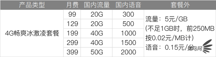 联通方面,如果对流量需求较多,同时有较多通话需求,可以选择“4G畅爽冰激凌套餐”,该系列套餐有99、129、199、299、399等多个档位可选,分别对应20G等多档位流量和300分钟等多档位通话。套餐外流量5元/GB,不足1GB时,前250MB按0.02元/MB计;语音0.15元/分钟。具体见下表: