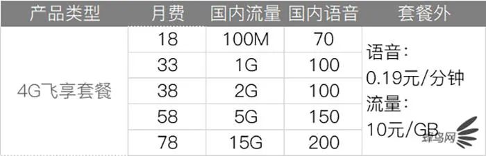 全球通系列套餐价格从128元起步,相对较贵,是否有更实惠的选择呢?那就是“4G飞享套餐”,最低只需18元分月费,适合几乎不使用流量的用户和偶尔打点电话的用户,具体档位见下表: