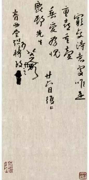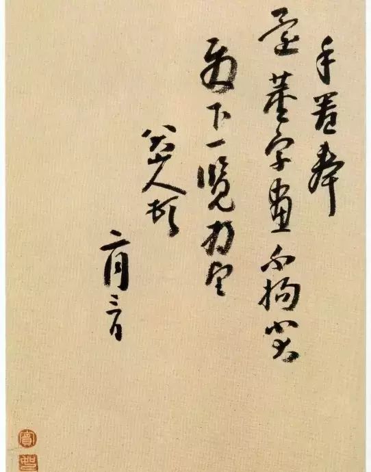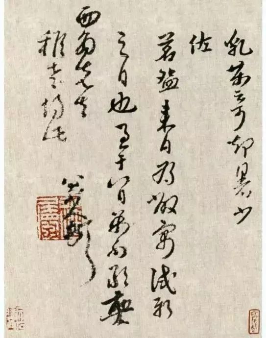 八大山人书法以中锋为笔法的基干,同时笔画粗细较为均匀,这很容易使人想到怀素的狂草,但两人又有明显的区别。怀素书写的速度很快,中锋和侧锋并用,也不回避尖刻的笔画,同时整个作品用笔的深浅仍有较大的变化。