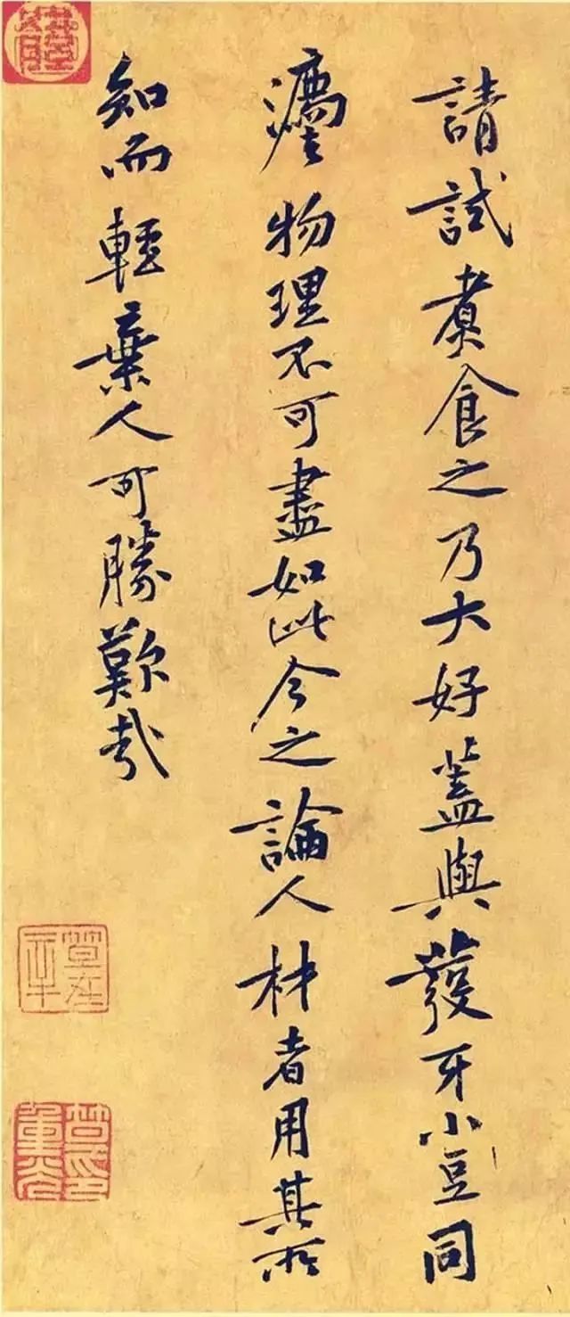 据宋·曾敏行《独醒杂志》记载,一天,苏轼对黄庭坚说:“庭坚啊,你近来写的字虽然清劲,但有时写得太瘦,简直就像挂在树梢上的蛇。”黄庭坚就回答说:“苏老师,你的字我当然不敢妄加评说,但有时也觉得你写得过于肥扁,很像是被压在石头底下的蛤蟆。”二人相视大笑,都认为对方说中了自己的缺点。