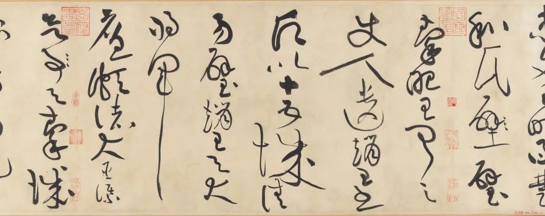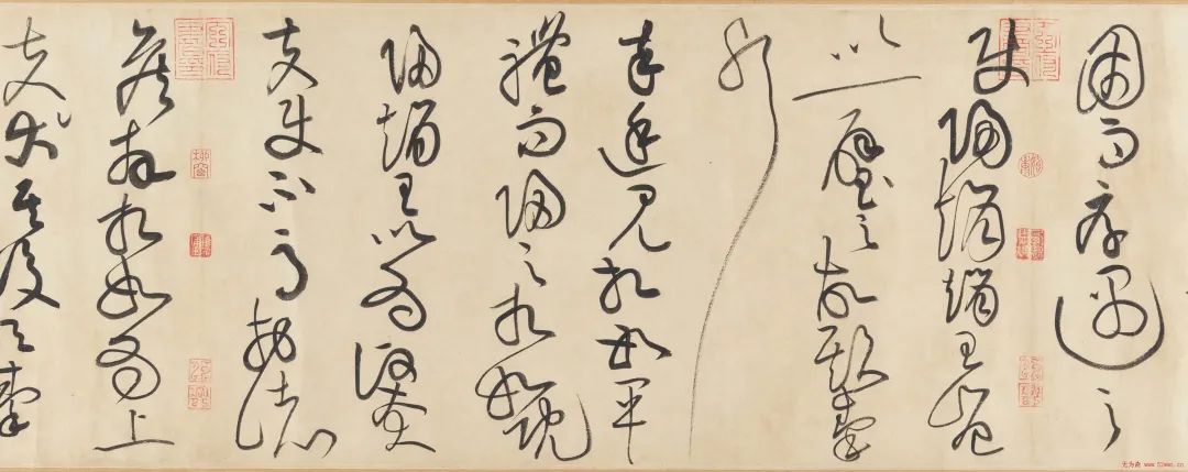 一个“描”字突出了黄庭坚书法隐含的绘画手法。明代文学家王世贞云:“石室先生以书法画竹,山谷道人乃以画竹法作书,其风枝雨叶,则偃蹇敧斜,疏绫劲节,则亭亭直上”。石室先生指的是以画竹闻名于世的书画大师文同,山谷道人即黄庭坚。意思是黄庭坚运用画竹的方法来写字,以“画竹法作书”,给人以“痛快飘逸”的感觉。仔细观察,黄庭坚的草书藏锋护尾,纵横奇崛,的确尤如片片竹叶,灵动飘舞,体现出劲节挺拔的超然气势。