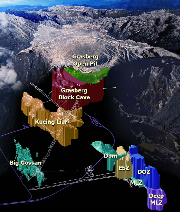 格拉斯伯格铜金矿为斑岩型铜金矿,附近的Ertsberg矿最早发现于1936年,自由港1960年代投入勘探,1972将之投产。15年后,自由港发现了格拉斯伯格铜金矿,1990年开始露天采矿。