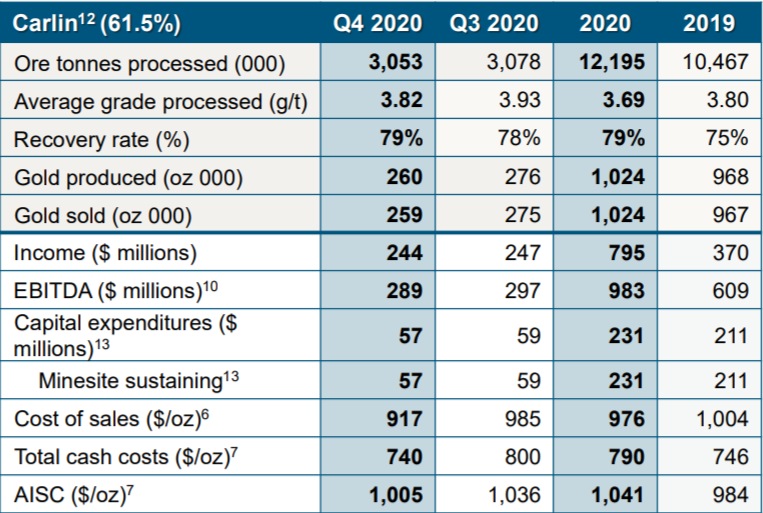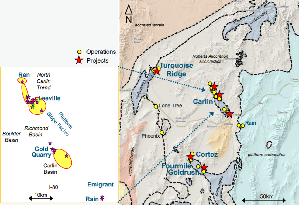 卡林金矿(Carlin)位于美国内华达州,属于全球两大黄金公司巴里克黄金(Barrick Gold,61.5%)和纽蒙特(Newmont,38.5%)合资的内华达金矿(Nevada Gold Mines),由巴里克负责运营。