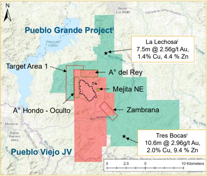 旧村金矿为非典型的高硫化浅成低温热液金银矿,目前拥有金资源量约500吨,并通过并购外围的大村(Pueblo Grande)项目获得外围勘探靶区,发现了较可观的矿化。
