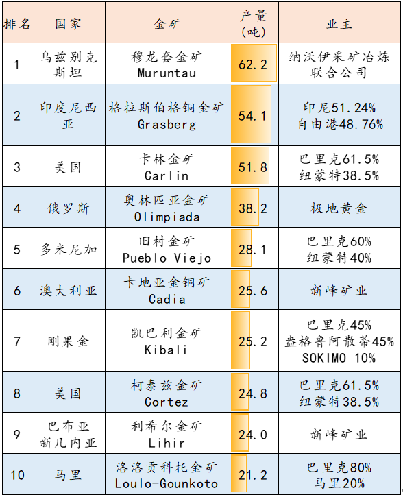 以上十大金矿基本信息如下表所示: