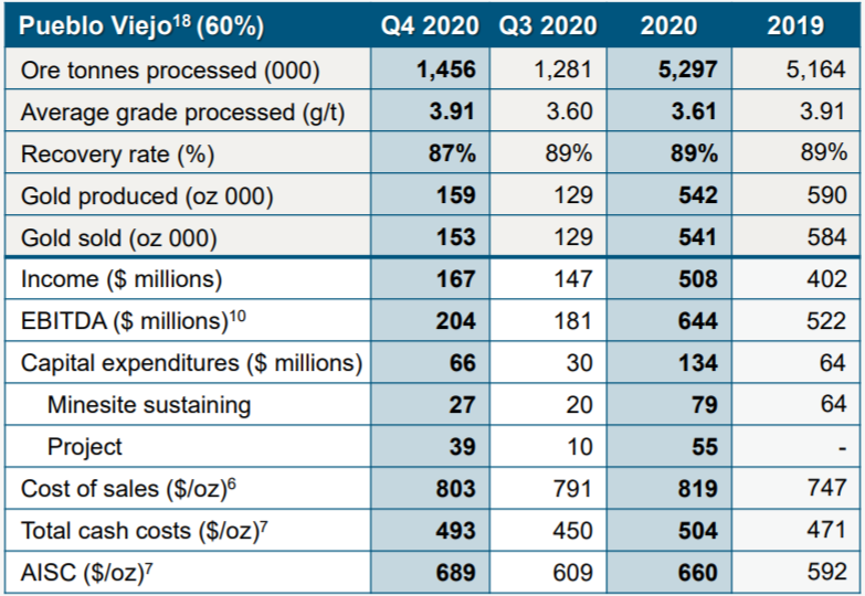 旧村金矿(Pueblo Viejo)位于加勒比海岛国多米尼加,由巴里克(60%)和纽蒙特(40%)合资所有,巴里克负责运营,露天开采,2012年投产。
