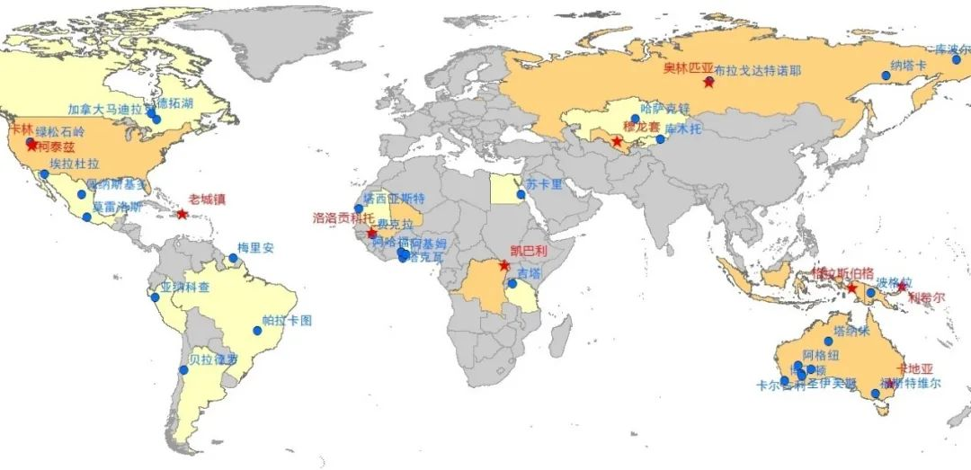 下图红星为十大金矿,蓝点为其余主要特大型金矿。