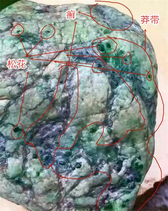 松花是翡翠原石含铬的钠铝辉石小晶体经过风化后,在玉石毛料皮壳上留下细小的呈短柱状、针点状、苔藓状的表现。