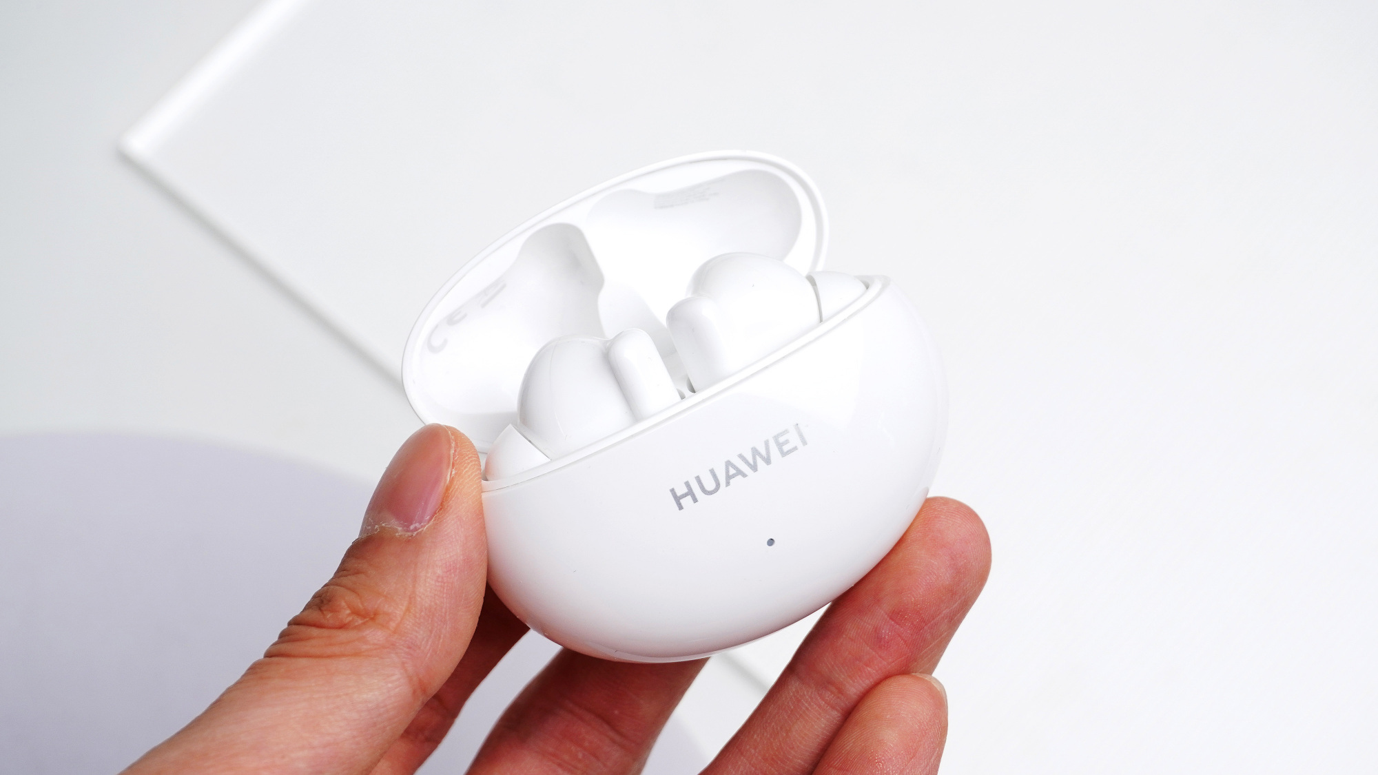 华为FreeBuds 4i正面和侧面是流畅顺滑的鹅卵石曲线造型,背面设有平面处,便于放在桌子上。必须强调的是,华为FreeBuds 4i电池舱相当精致,能很轻松地握在掌心里。