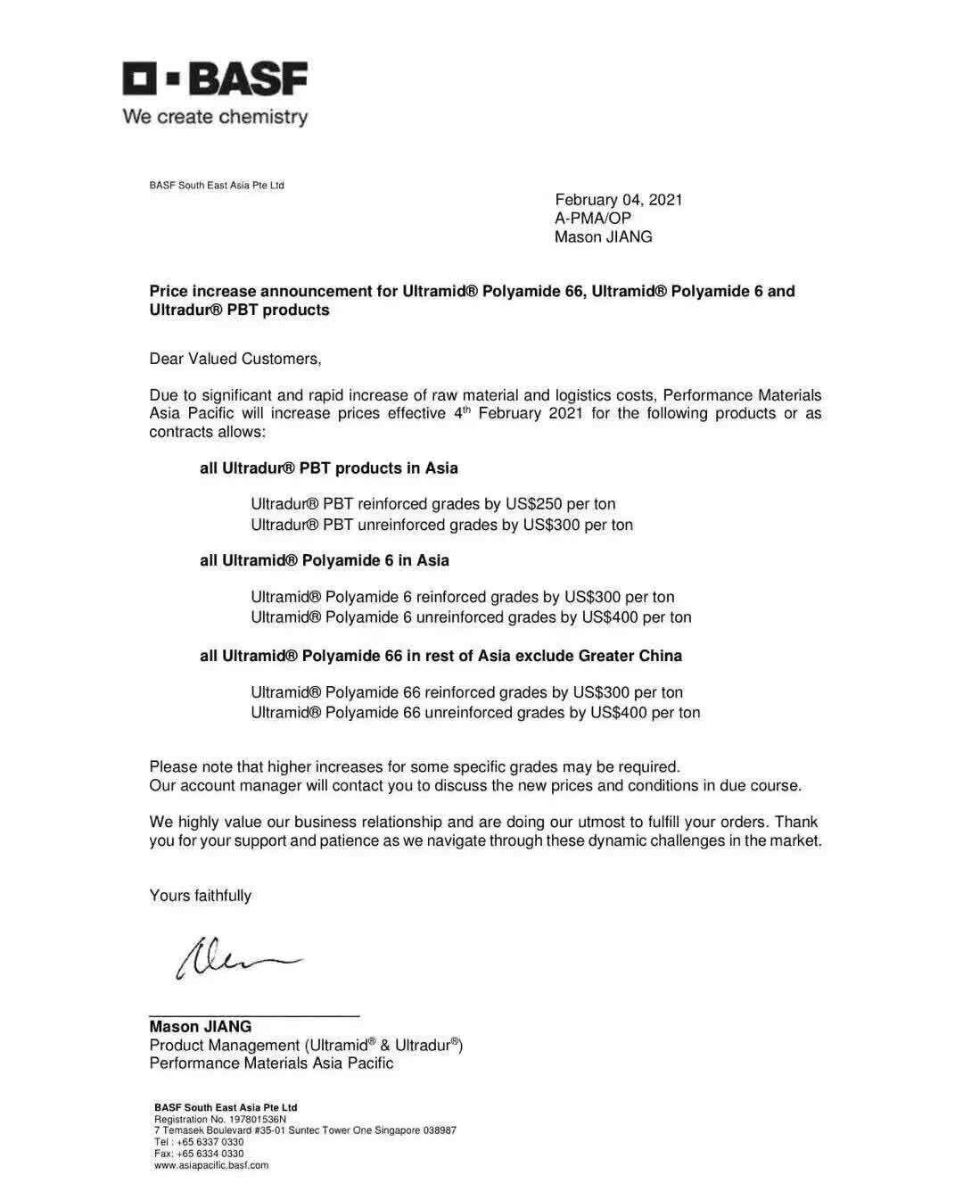 巴斯夫发布涨价函,由于原材料和物流成本快速增长,现将在亚太地区进行如下产品相关价格上涨: