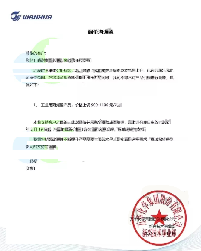 万华化学发函,称19日起,工业用丙烯酸产品,价格上调900-1100元/吨。