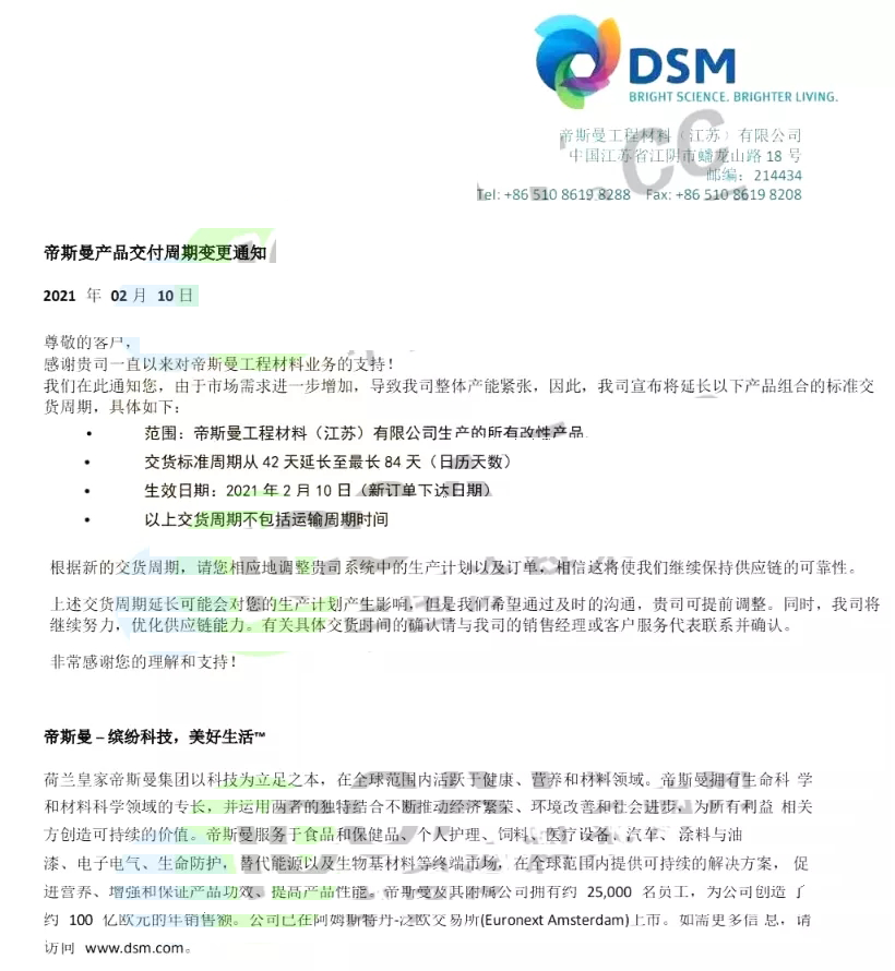 帝斯曼工程材料(江苏)有限公司发函称,所有改性产品交货标准周期从42天延长至84天(日历天数),生效日期为2月10日(新订单下达日期)。