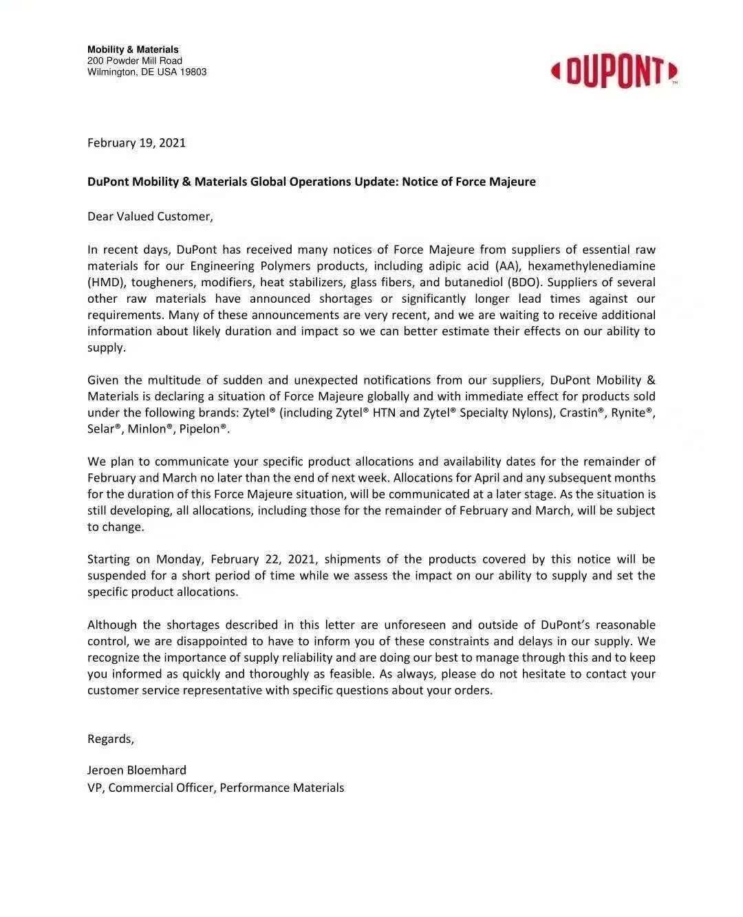 杜邦发函称,鉴于供应商的大量突发和意外通知,杜邦移动与材料公司宣布在全球范围内发生不可抗力情况,并立即影响以下品牌的产品:Zytel“(包括Zytel* HTN和Zytel“特种尼龙),Crastin*,Rynite*,Selar, MinlonR,Pipelon。由于情况仍在发展,所有的拨款,包括2月和3月剩余时间的拨款,将会有所改变。从2021年2月22日(周一)开始,本通知涵盖的产品的发货将暂停一段时间。