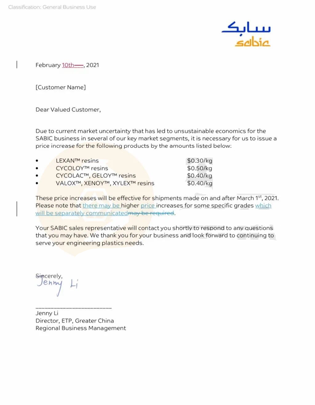 SABIC宣布PC、PC/ABS、ASA、ABS、PBT、PBT/PC、PET/PC涨价300~500美元/吨不等。