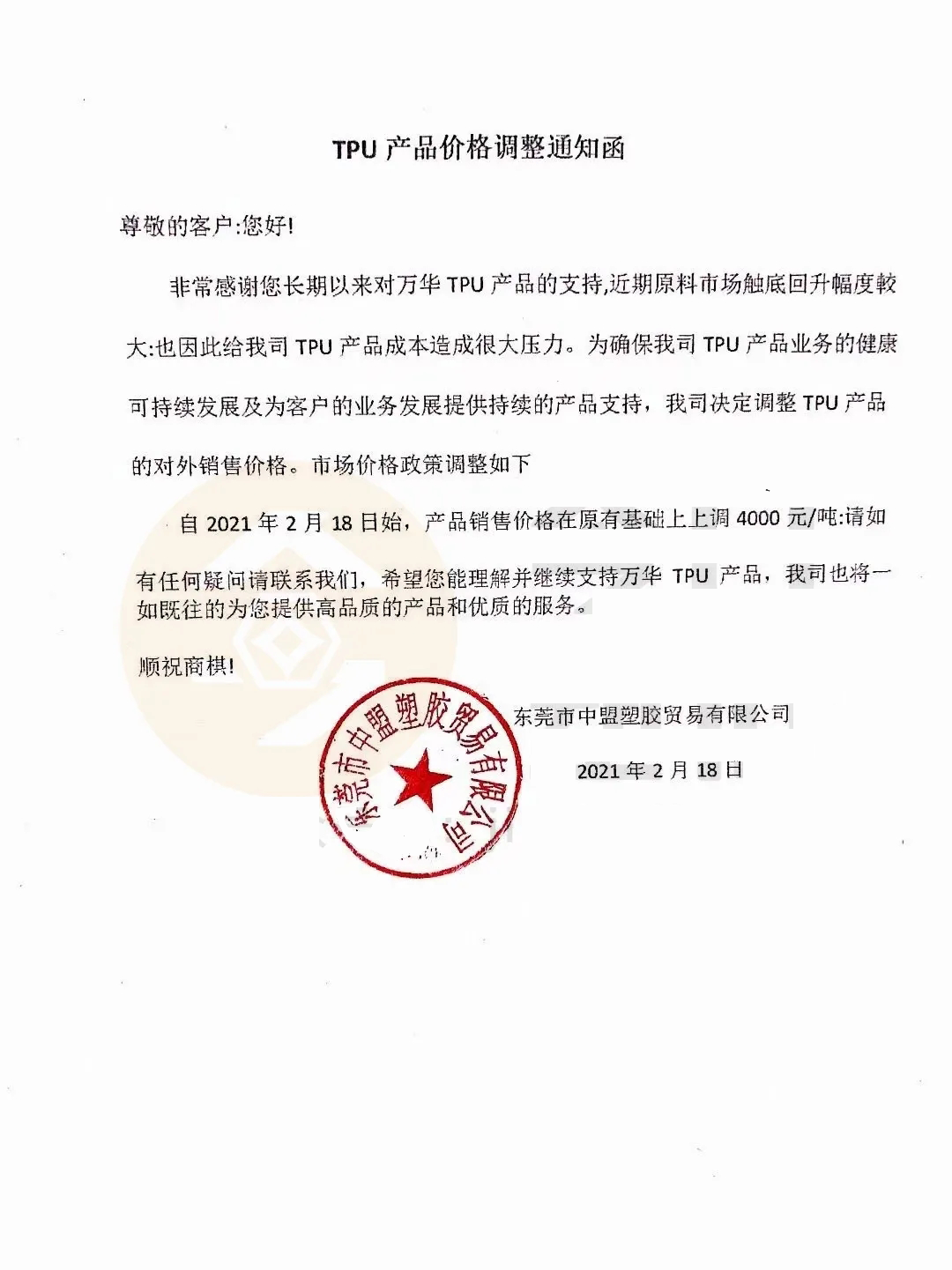东莞市中盟塑胶发布TPU涨价函,称2月18日起,产品销售价格在原基础上上调4000元/吨。