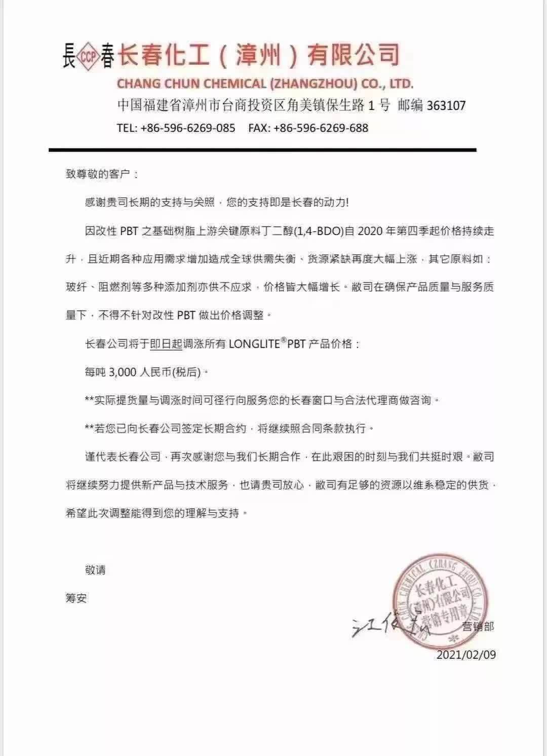 长春化工(漳州)有限公司发函,称因改性PBT基础树脂上游关键原料正丁醇自2020年第四季度起价格持续走升,且近期各种应用需求增加造成全球供需失衡、货源紧缺再度大幅调涨,即日起调涨所有LONGLITE PBT产品价格,上涨3000元/吨。