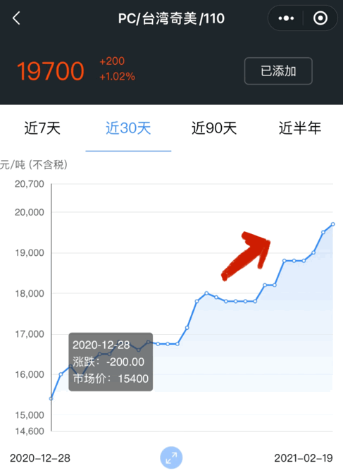 塑料市场近期涨幅甚巨,PC/台湾奇美/110从12月28日的15400元一吨,一路上涨至2月19日的19700元一吨,上涨4300元,涨幅27.92%,不可谓不惊人!