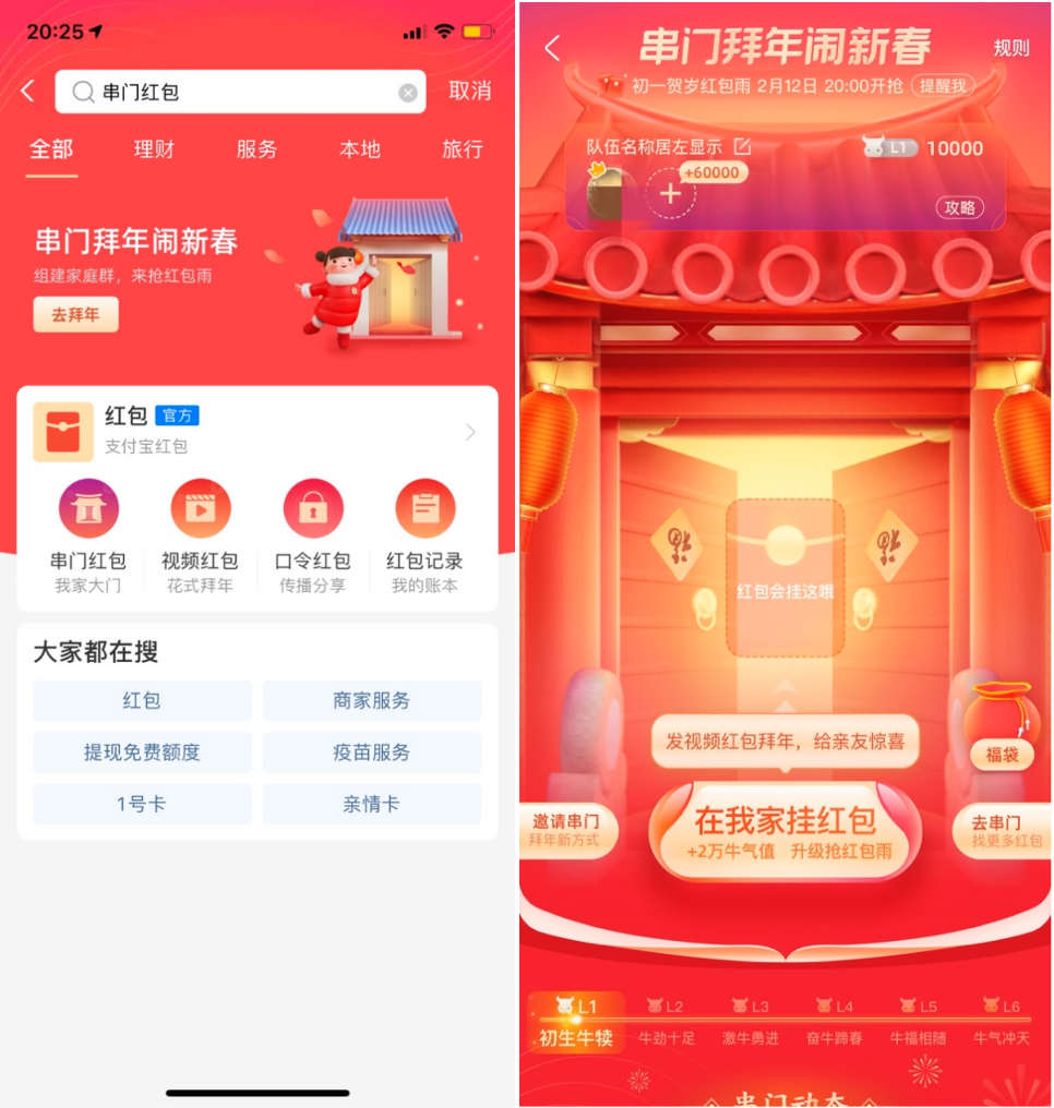 正月初一拜大年,走亲访友派红包必不可少,为了让就地过年也年味十足,继新春五福后,2月11日,支付宝红包也迎来升级,新增“串门红包”、“PK红包”两大玩法,让用户足不出户也能花式“云拜年”、“云串门”。