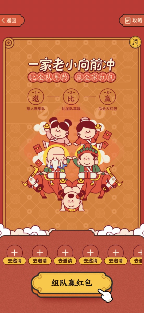 针对节庆期间流行的抢红包,支付宝也进行了玩法升级,家庭组队PK瓜分8000万奖池。 从正月初一到十五,用户通过支付宝搜索“比谁牛”即可参与,邀请亲朋好友组队或助力,为队伍增加年龄值。队伍年龄值总和更高的一方,可赢得PK并瓜分当日红包。这意味着,老年的用户或成为香饽饽,小辈也能带动长辈参与线上红包游戏中。