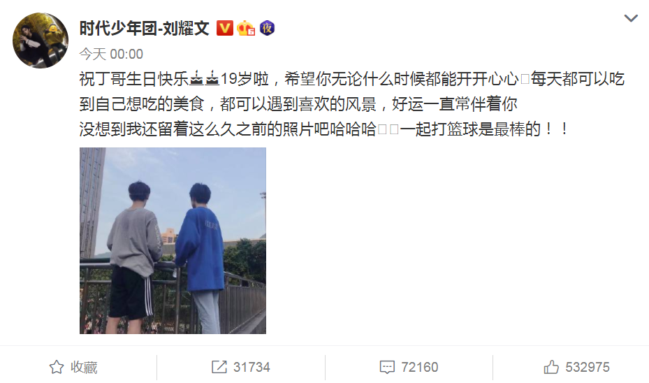 刘耀文配文;“祝丁哥生日快乐,19岁啦,希望你无论什么时候都能开开心心,每天都可以吃到自己想吃的美食,都可以遇到喜欢的风景,好运一直常伴着你。没想到我还留着这么久之前的照片吧,哈哈哈,一起打篮球是最棒的。”