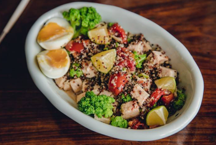 用水冲洗藜麦1分钟,然后放入水里高火煮沸,盖上锅盖低温煮上15-20分钟,捞起,完全冷却;把藜麦放入大碗,加入熟鸡胸肉、小番茄、西兰花,备用(也可根据自己口味搭配沙拉食材);把油,醋糖,盐放入小碗中搅拌,倒在藜麦上面轻轻摇晃直到混合,即可上桌。