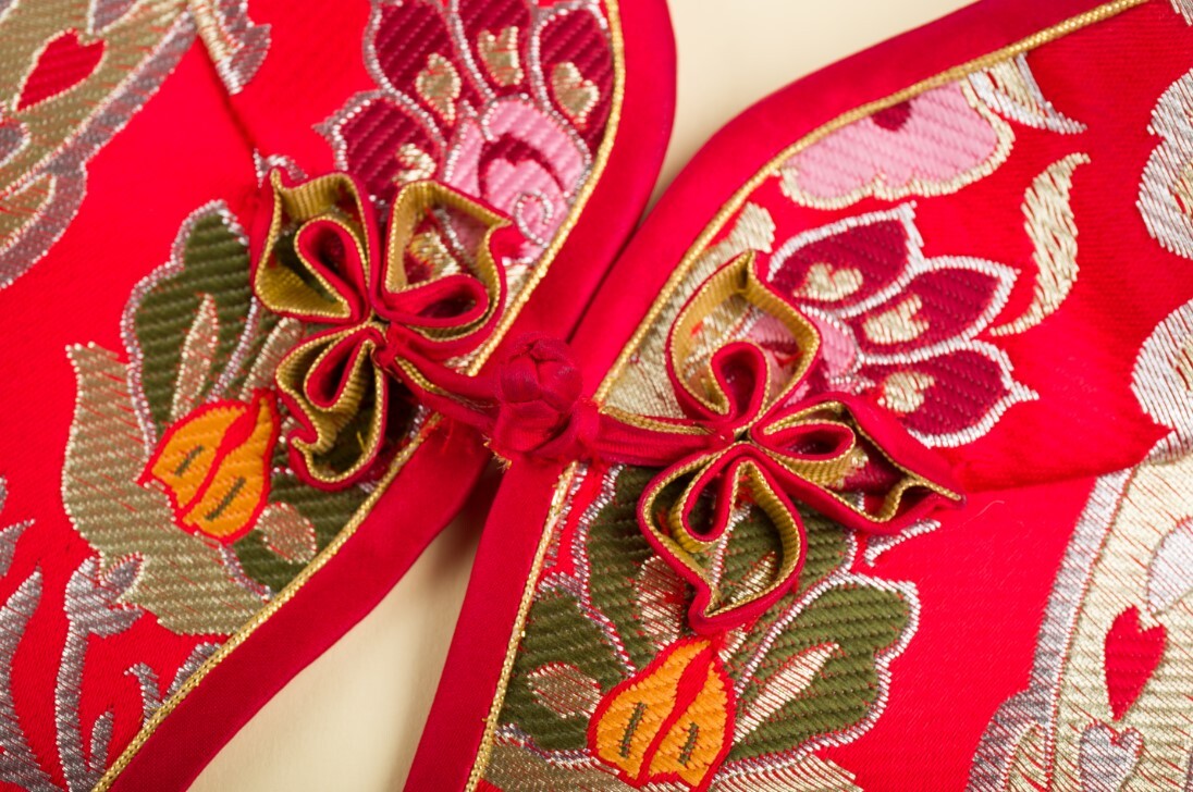 盘扣的花式种类丰富,有模仿动植物的菊花盘扣、梅花扣、金鱼扣、盘结成文字的吉字扣、寿字扣、囍字扣等。也有几何图形的,如一字扣、波形扣、三角形扣等。盘花分裂两边,有对称的,有不对称的。盘花扣的作用在中国服饰的演化中逐改变,它不仅仅有连接衣襟的功能,更称为装饰服装的点睛之笔。生动地表现着服饰重意蕴、重内涵、重主题的装饰趣味,蕴藏着质朴、自然的情愫,蕴含着人们对美好生活的寄托和追求,还具有招福纳祥、传情达意的含义。