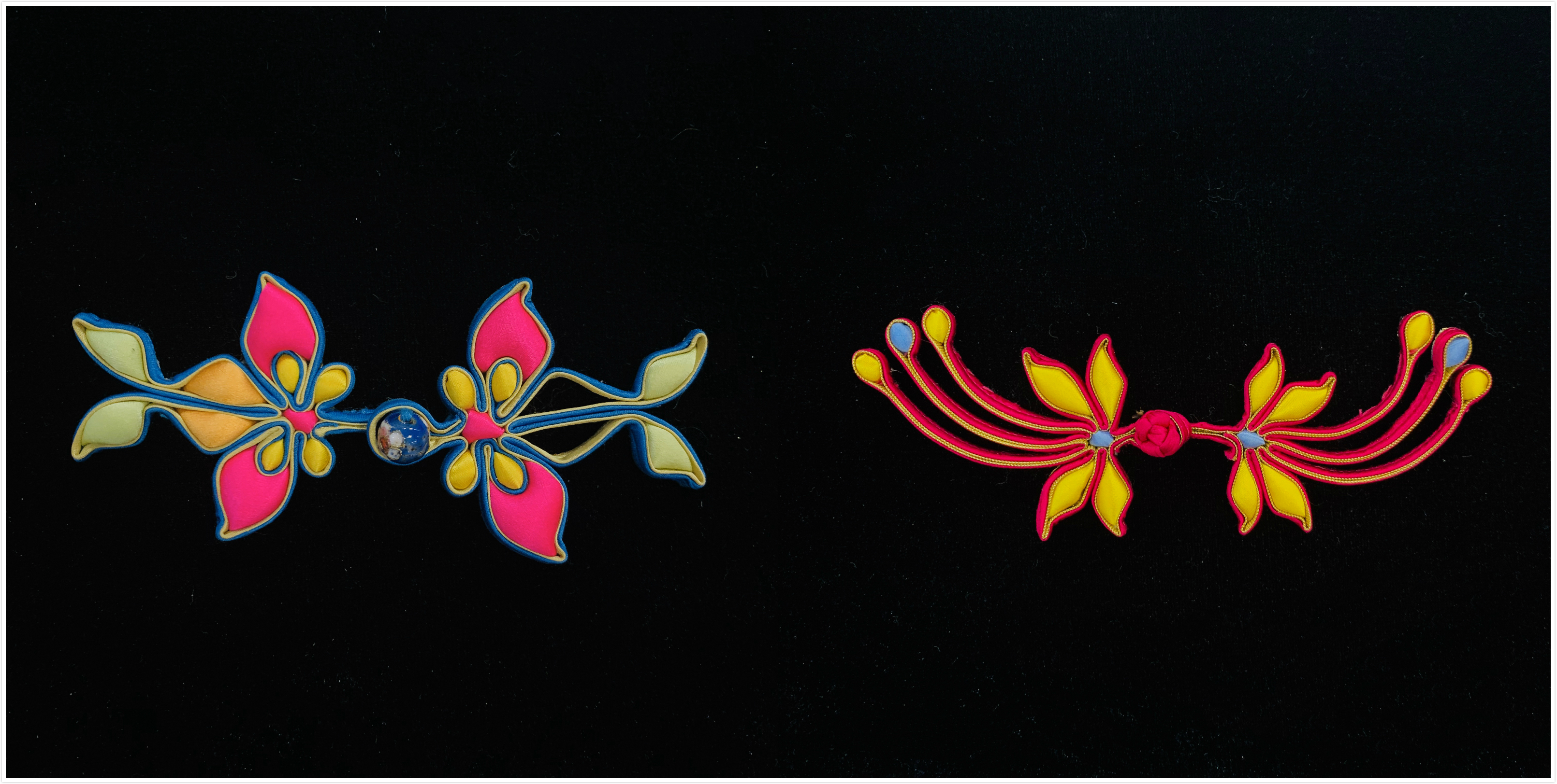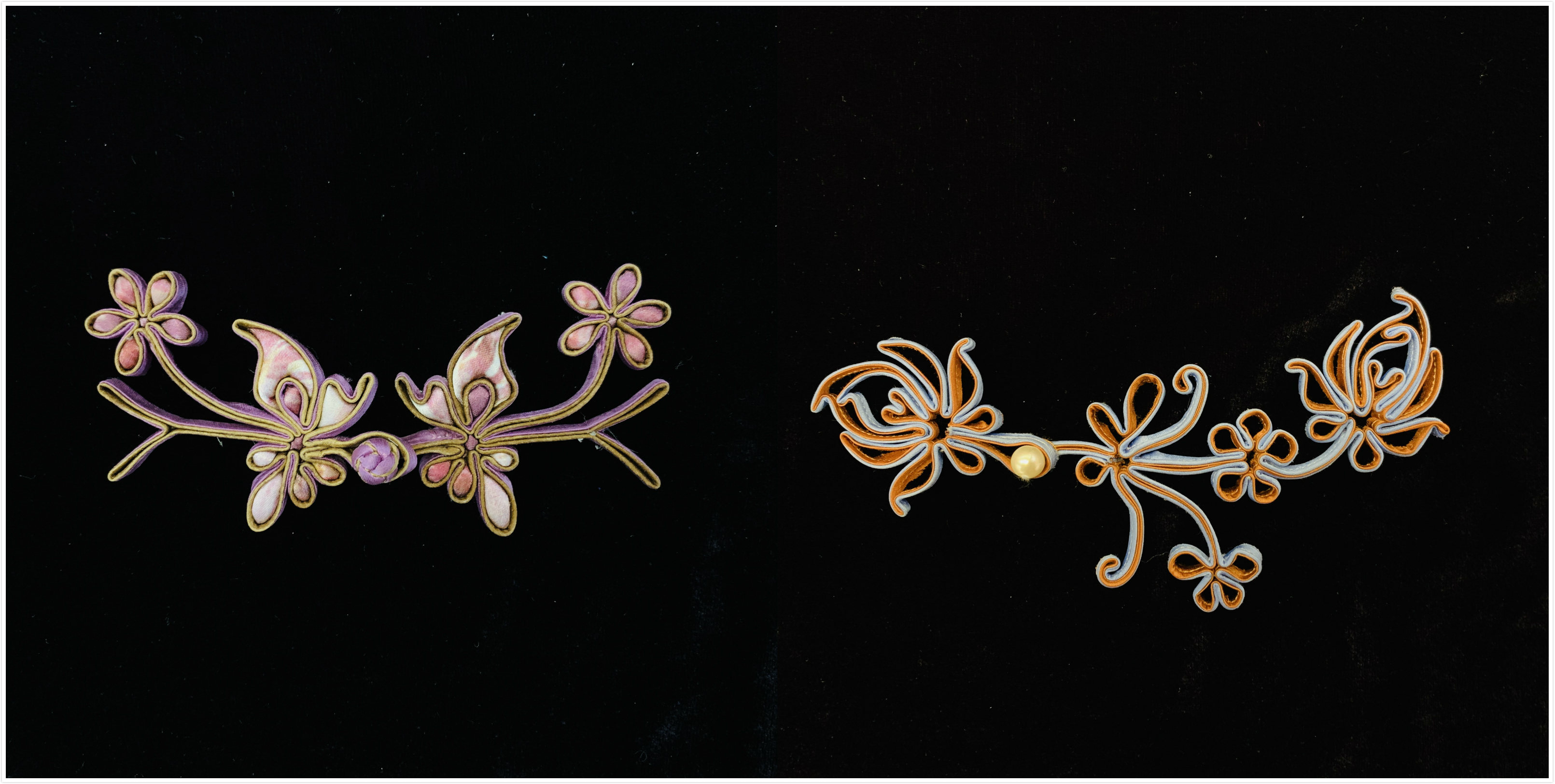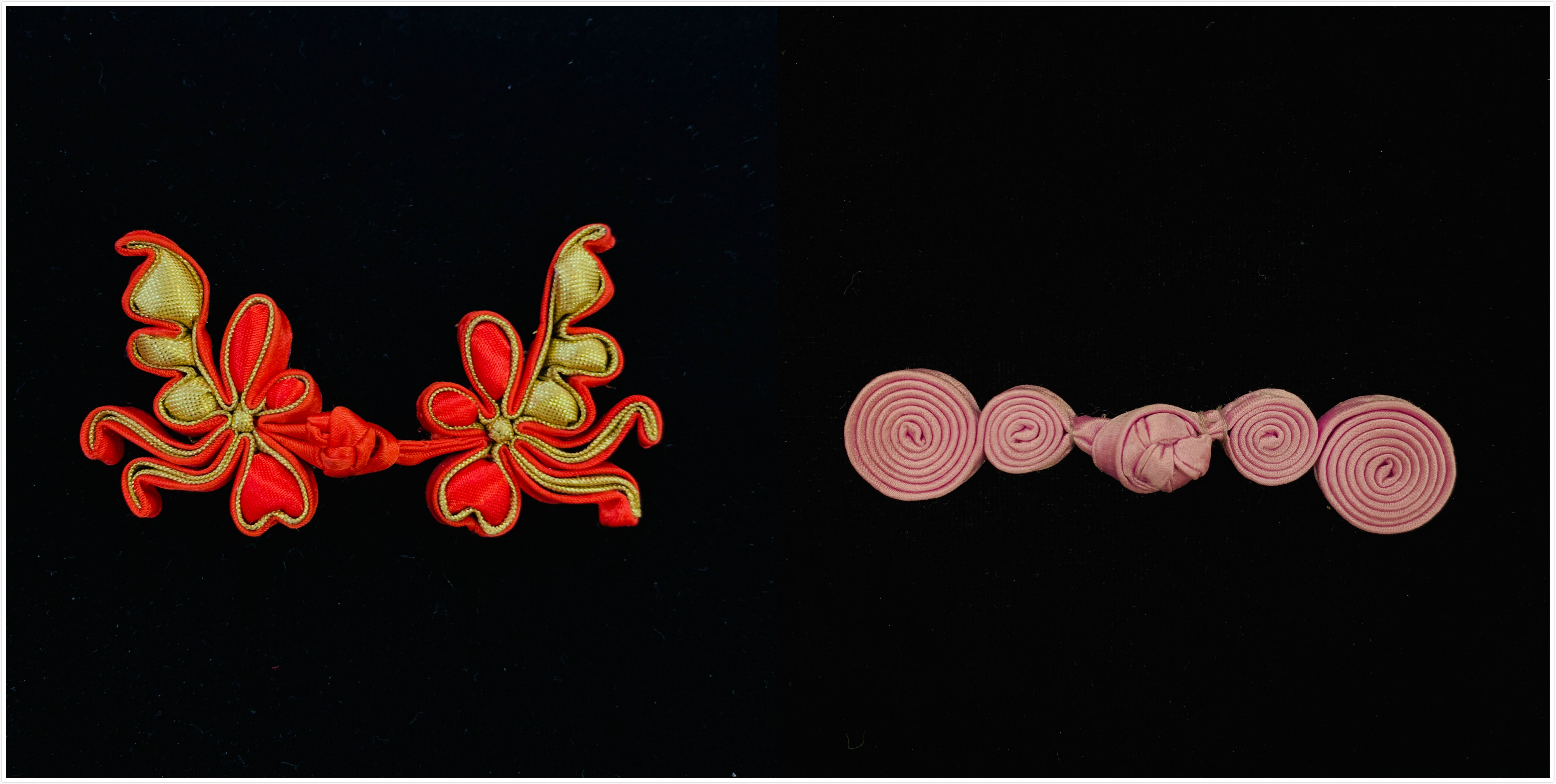 盘扣的扣子是用称为“袢条”的折叠缝纫的布料细条编织而成,做装饰花扣的袢条一般则内衬金属丝,以便于定形。