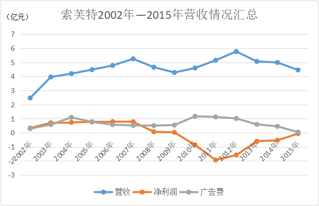 另外就是继续加大营销投入。在2010年,索芙特的广告费用增长了1倍,达到了1.2亿,此后的两年一直维持在1亿以上。但这带来的营收增长并不明显,从2010年至2012年,这三年间最高的增长也就12%。而这的代价是每年巨额的亏损,三年总计亏损了4.4亿,其中亏损最多的2011年亏损额接近2亿,而那一年索芙特的总营收也才5个亿。