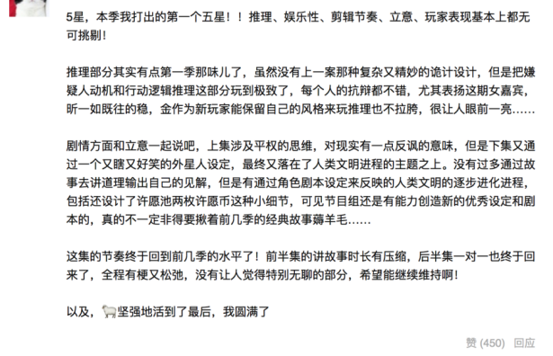 许多节目老粉会把第一季视作初心,认为那时的节目搞笑与推理并行,且识于微时的那批老玩家之间有不可替代的“团魂”。而随着节目进行到N代,观众和节目组其实都在进行重新定位。