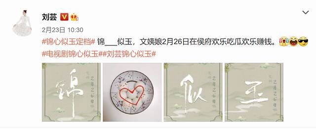 如今,电视剧《锦心似玉》即将播出,演员刘芸也在个人微博上积极进行宣传,“文姨娘2月26日在侯府欢乐吃瓜欢乐赚钱”,文案也很符合商人特色。