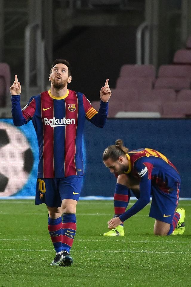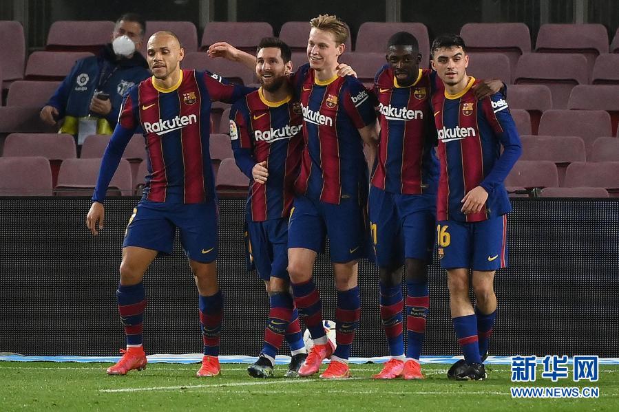2月24日,巴塞罗那队球员庆祝梅西(左二)的进球。 当日,在2020-2021赛季西班牙足球甲级联赛第一轮的一场补赛中,巴塞罗那队主场以3比0战胜埃尔切队。 新华社/法新