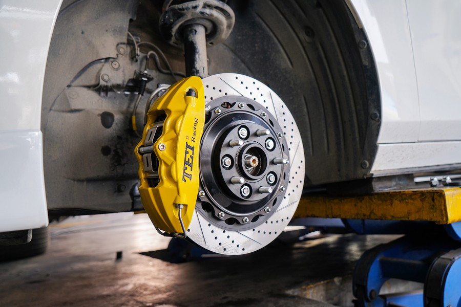 改装产品:P40NS黄色大四活塞卡钳,搭配355x28mm打孔划线纹分体盘;