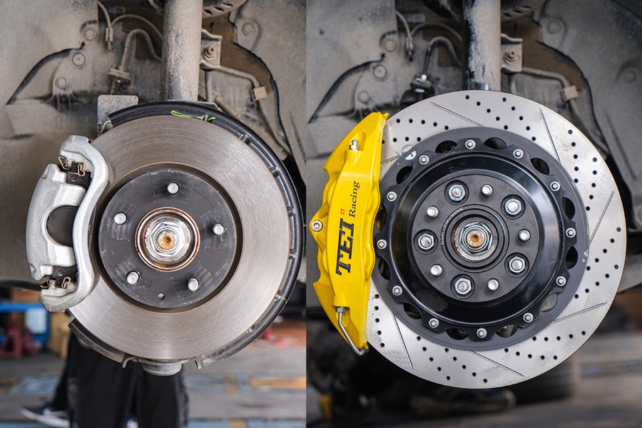 另外,原厂的卡钳是单面活塞卡钳,TEI卡钳是对置双活塞卡钳,刹车效果更好,更加线性。