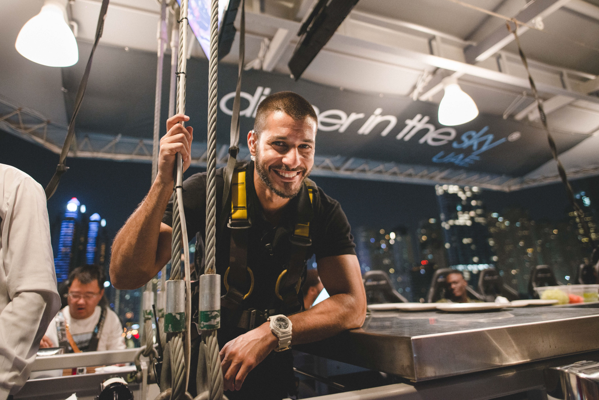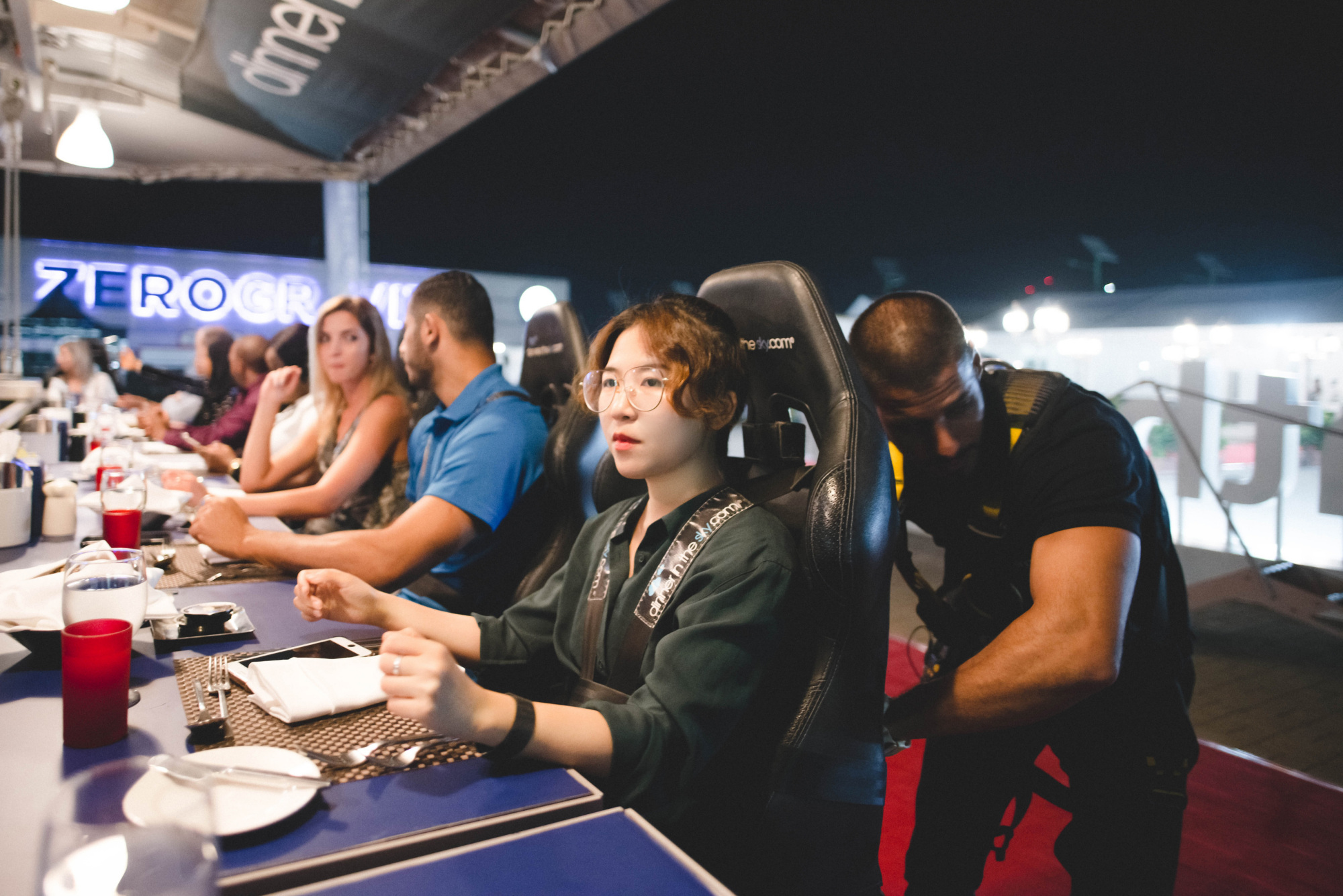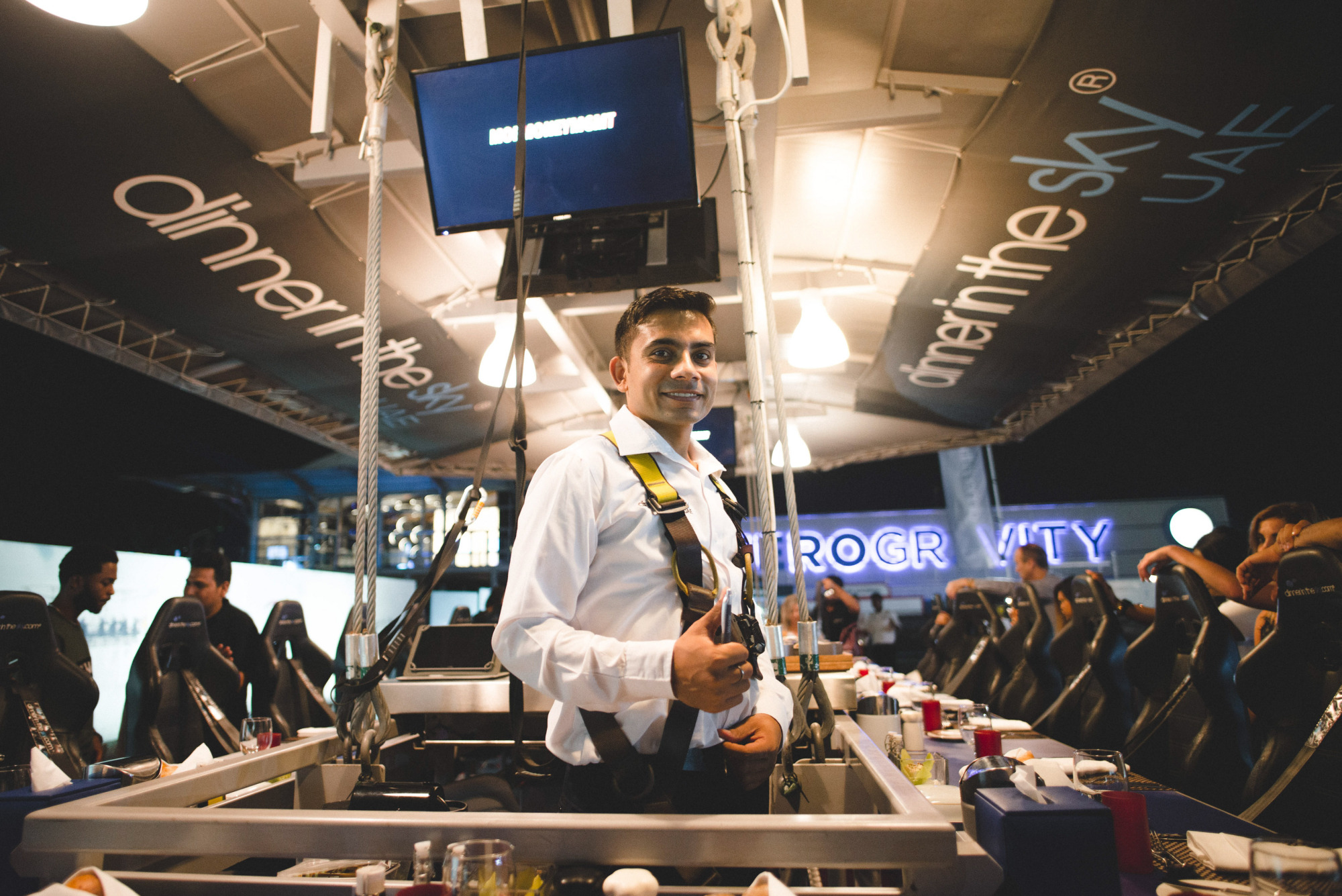 一次用餐人数最多只能容纳22位。等到全员客人都到齐后,服务员开始为我们讲解一些注意事项。之后,我们就被“绑”在椅子上,然后起重器开始把我们慢慢吊了上去。原以为会有点晃动惊险,但实际情况是异常稳,完全不用担心害怕。