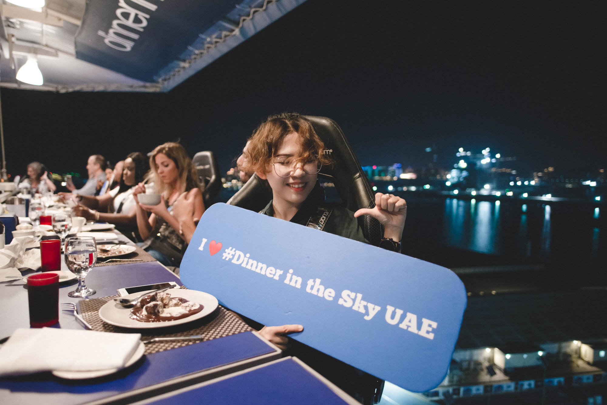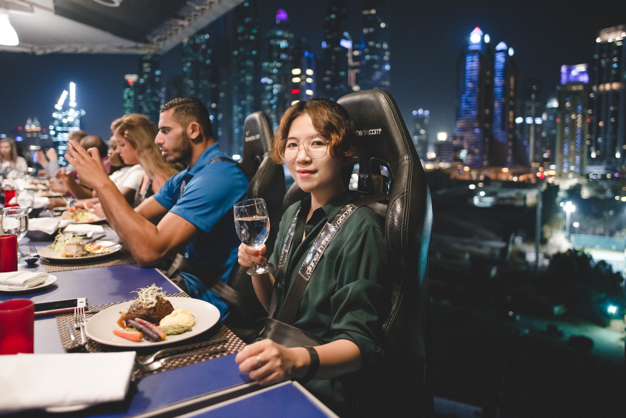 等到整个餐厅提升至50米的高空后,餐厅就会停在空中,所有人就可以开始边欣赏迪拜夜景边享用晚宴啦~此时的迪拜已经华灯初上,我们可以看到夜色中的港湾和灯光通明的高楼大厦。处于悬空状态品味美食和景色,和在高层餐厅吃饭的感受还是十分不同的。