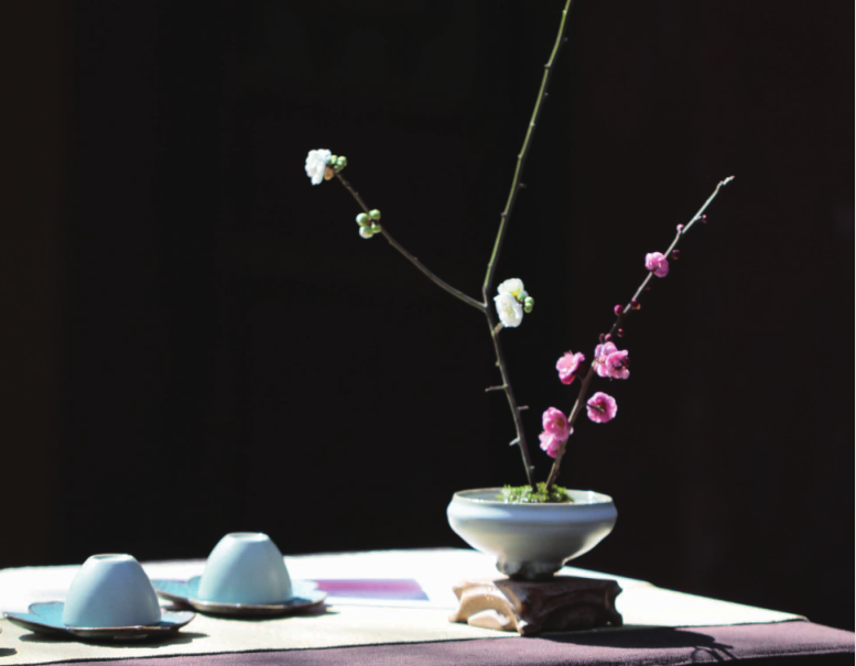 例如:在瀹泡凤凰单丛、茉莉花茶等高香茶的茶席上,可以选择娇媚无香的海棠。海棠的红粉妖娆,与橙黄的茶汤,正好形成美妙的映照。此时的茶意,真应了“自今意思和谁说,一片春心付海棠”。如果是汤色深红的普洱茶、武夷岩茶等,可以选择素白淡雅的梅花、玉兰、水仙等,白花一簇,映照着红中透亮的茶汤,顿生踏雪寻梅之妙。