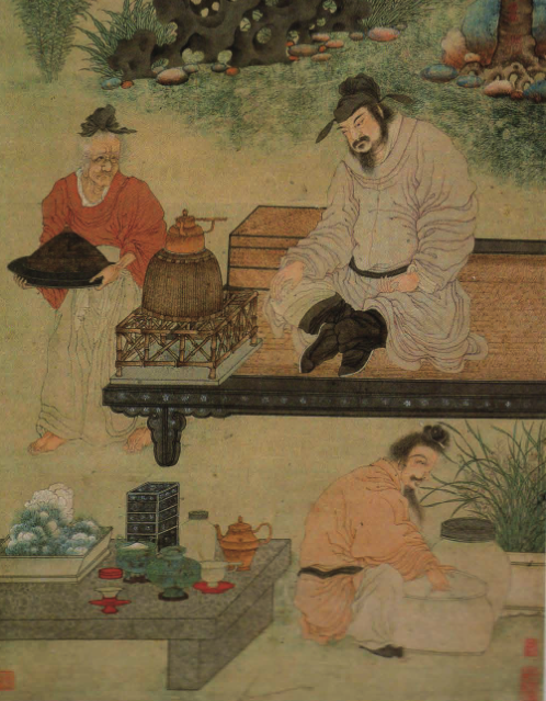 (明代丁云鹏的《煮茶图》:玉兰花下一席茶,画中可见竹茶炉、朱红茶托、白色茶盏等)