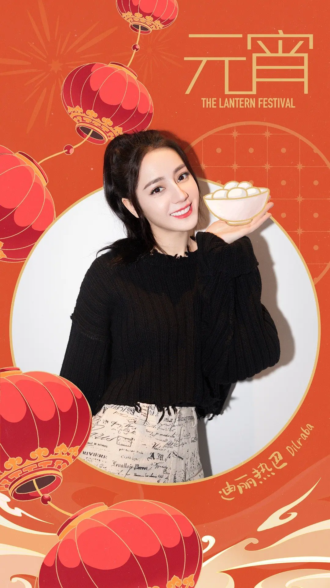 迪丽热巴的祝福图俏皮可爱些:头扎马尾,身穿黑色毛衣搭配白色半裙,手托一碗汤圆冲着镜头笑,整体都洋溢着青春的气息。在元宵的红色背景衬托下,自然清新妆容的热巴,更显肤白貌美,气质不俗。