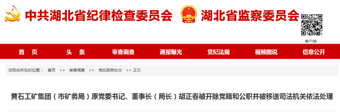 2、黄石工矿集团(市矿务局)原党委书记、董事长(局长)胡正春被开除党籍和公职并被移送司法机关依法处理