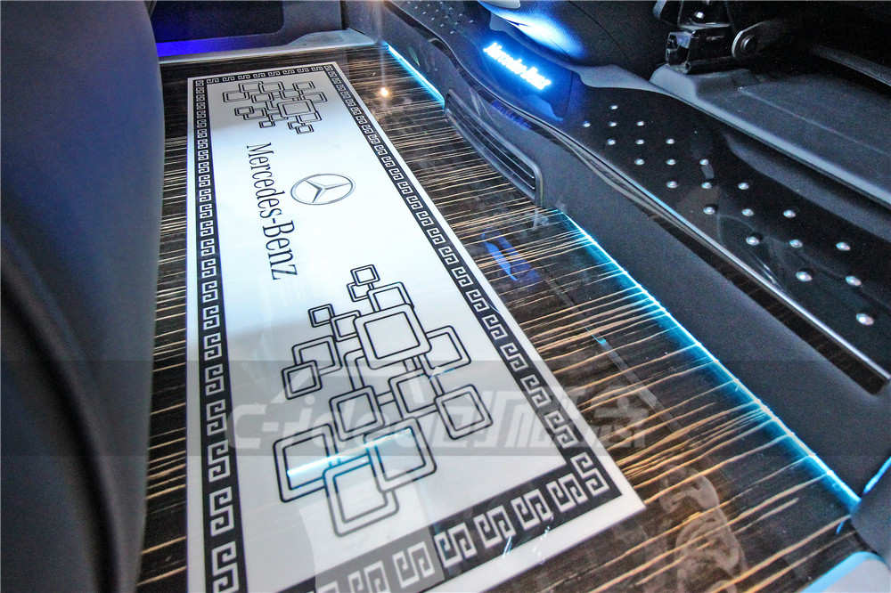 打开乘坐舱的电动车门,看到的是镜面材质的印花地板。对比原车的毛绒地毯,镜面地板更易清理,更美观。对比原木地板,镜面地板寿命更长,我愿称之为性价比之王。