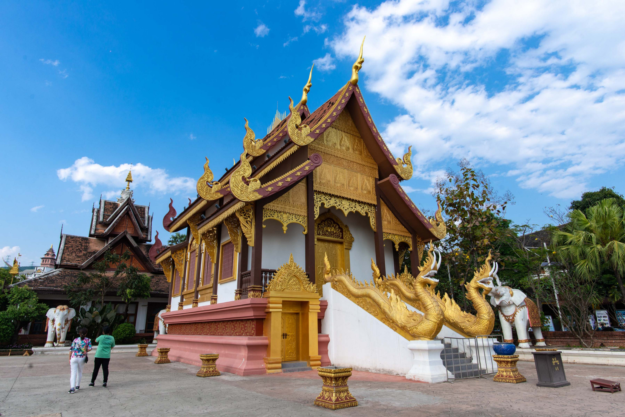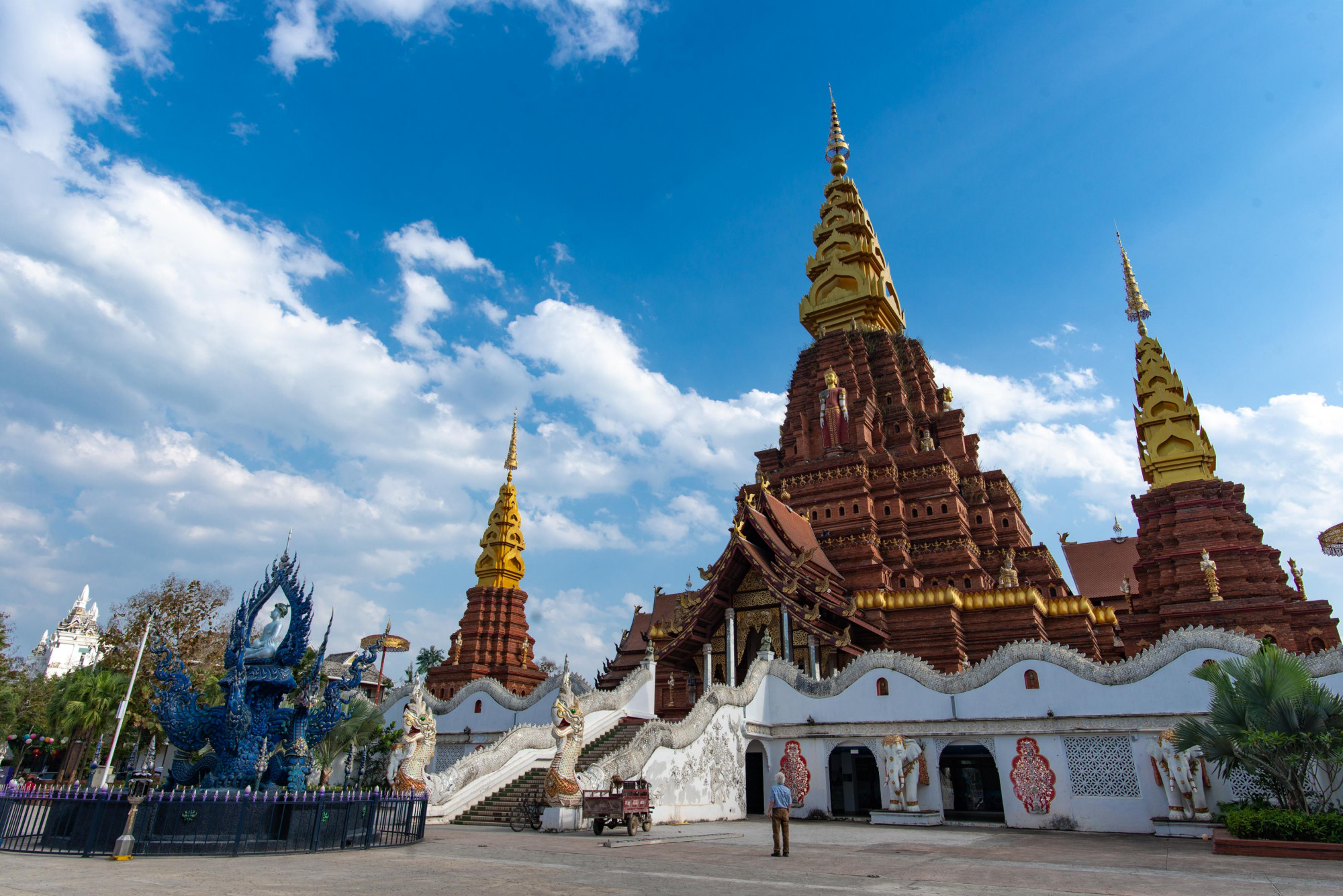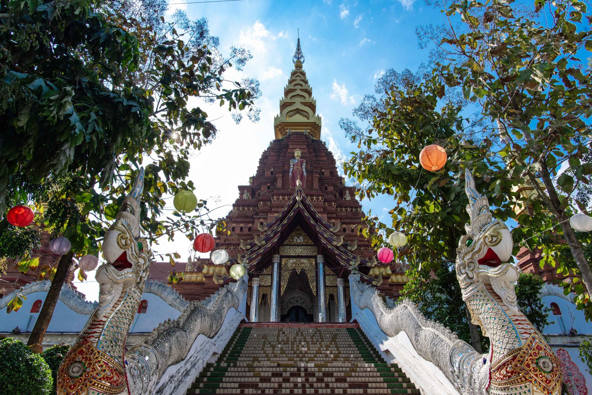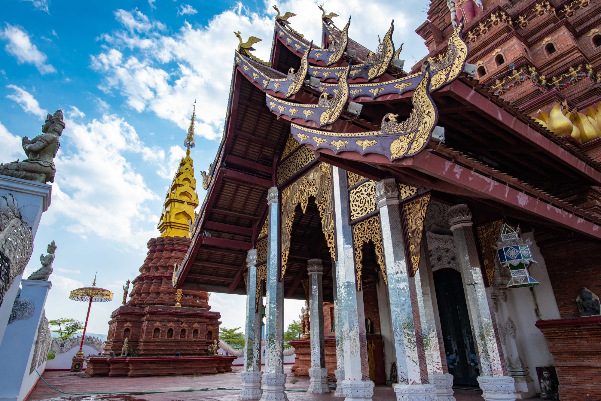 寺院的东西南北各面都有一条龙道,龙身精雕细琢,周身装饰着用玻璃镜片切成的晶片,在阳光照射下显得格外耀眼。人还未走近,就已经被龙威所摄。檐角的装饰犹如展翅的孔雀,寓意着吉祥、幸福、美丽。