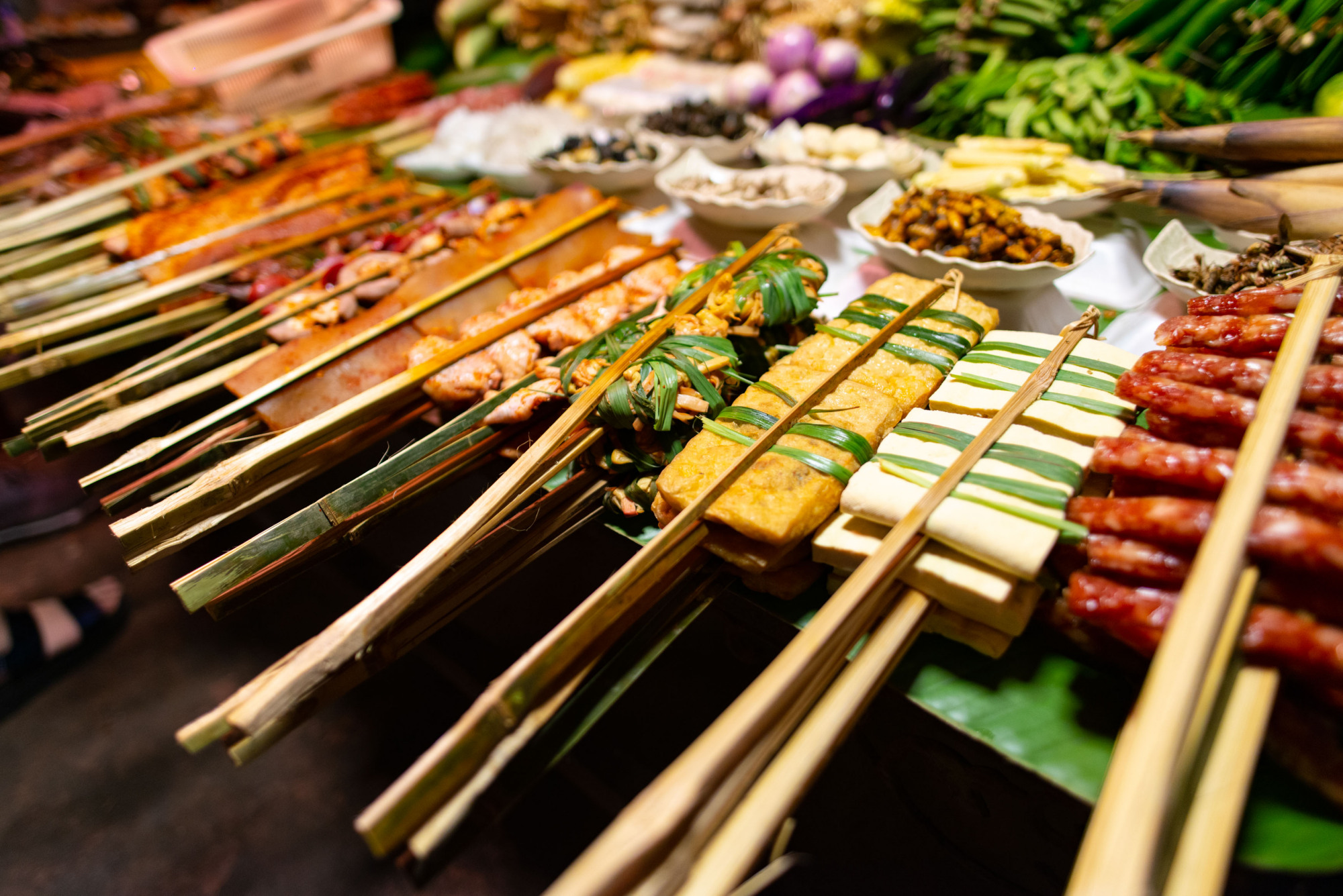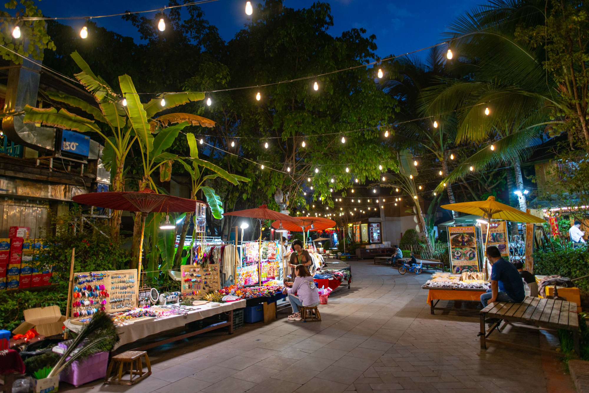 每个摊位的顶棚都是油纸伞,每个棚顶又都颜色不一、色彩斑斓,为曼妙的夜色再增添了几许艳丽。这里的小吃摊绝对是最受欢迎的摊位,所有东西都明码实价,食材也是干干净净、摆放得非常整齐。特色的“傣味烧烤”等待着往来的顾客挑选与品尝。