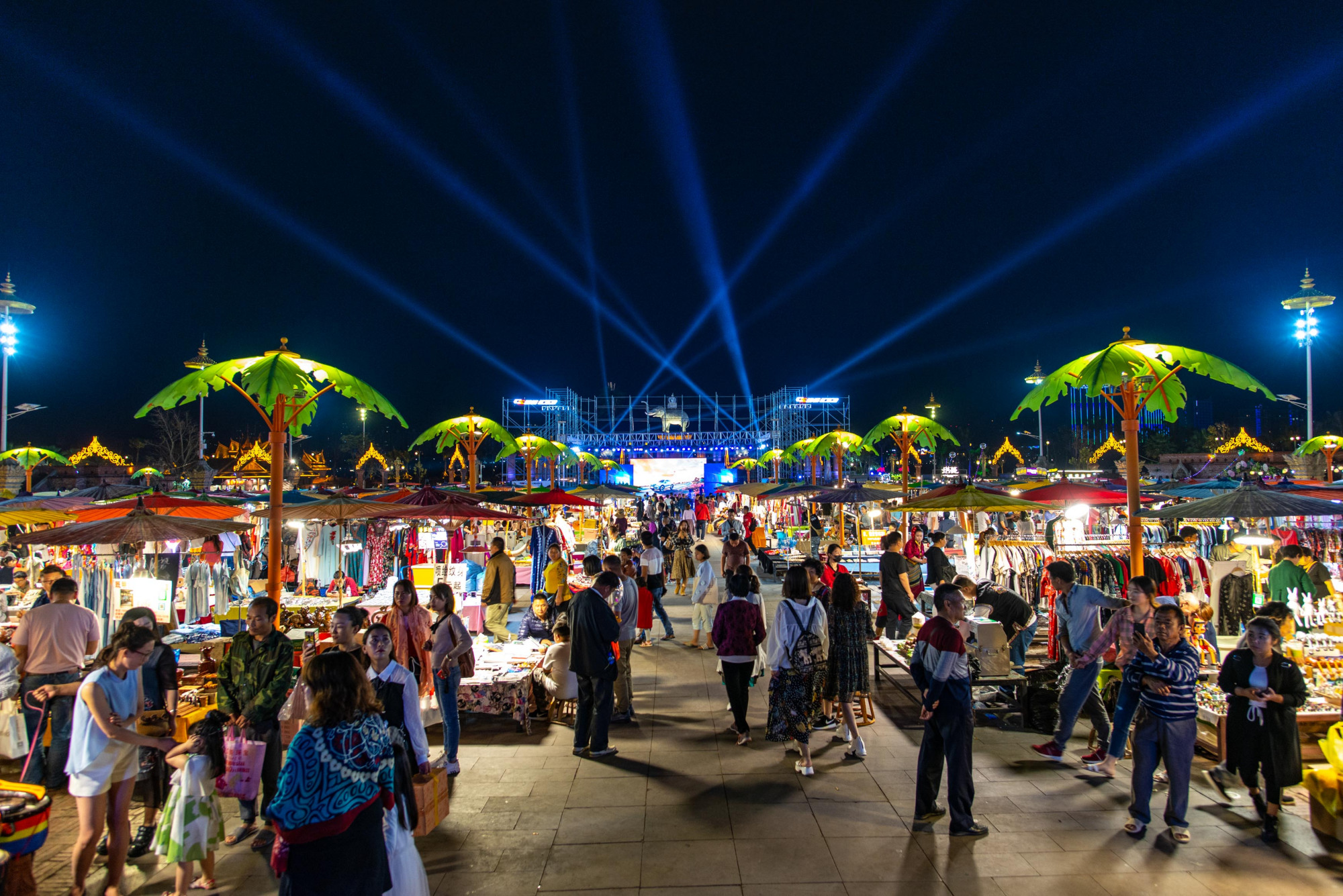大金塔寺前的广场上就是夜市。夜市的占地面积不小,有几百个摊位,最多的就是小吃摊,各色美食吸引着络绎不绝的游客。站在高处的台阶上可以看到底下星星点点的光亮连成一片,因此也称“星光夜市”。各摊位井然有序,人群熙熙攘攘,好不热闹。