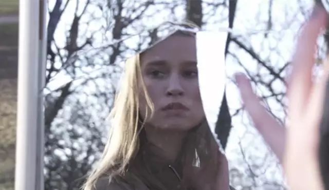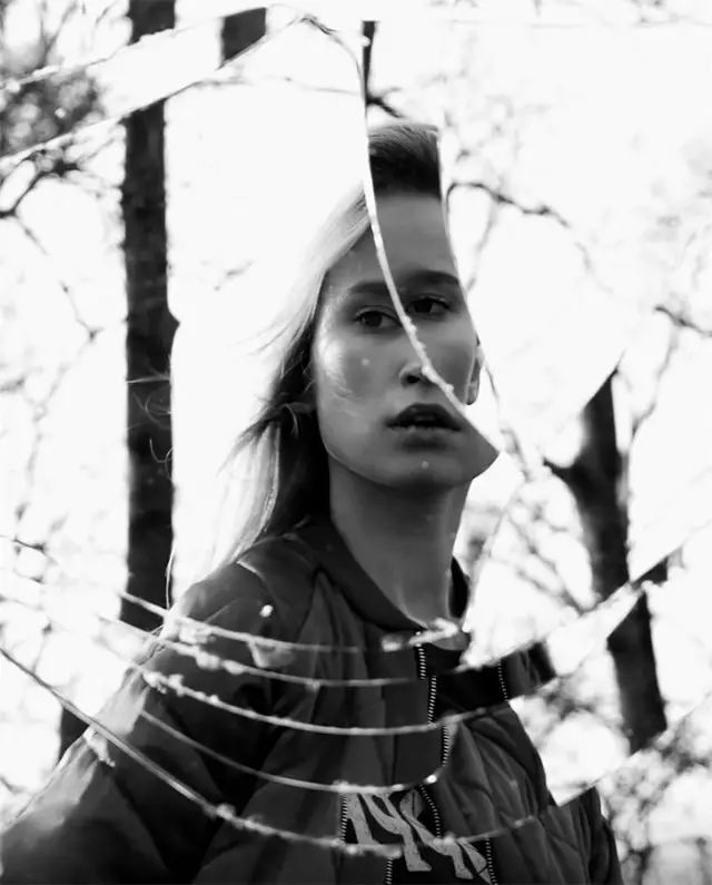 然后,让模特面对破镜子摆好 POSE,摄影师不断调整角度取景: