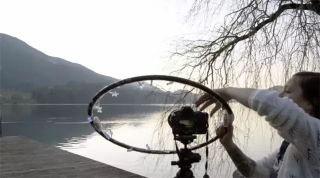 然后架设好三脚架,设置好长曝光,点亮小彩灯,让助手在旁边拿着呼啦圈慢慢转动: