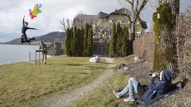 用高速快门抓拍瞬间的画面,一张假悬浮照就完成了: