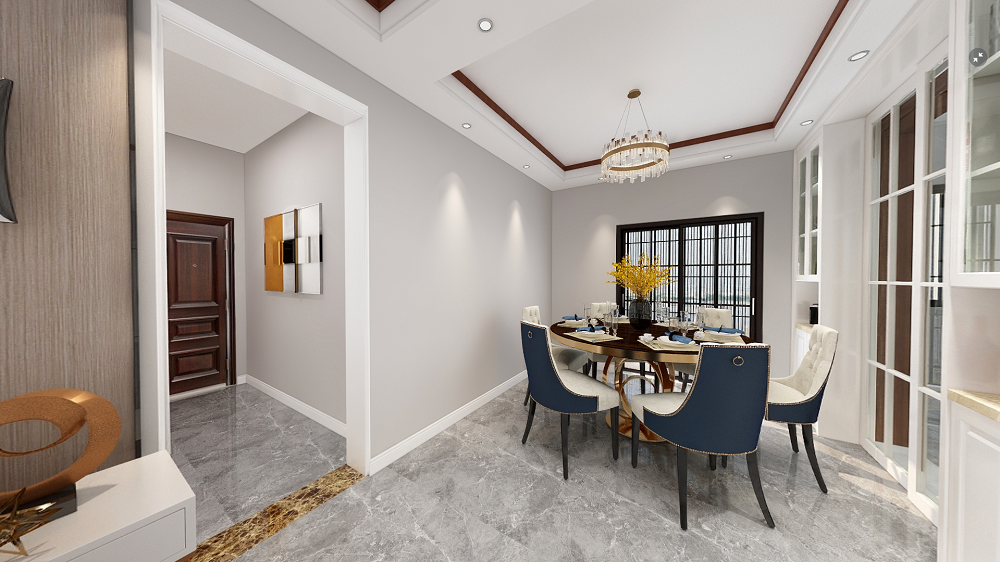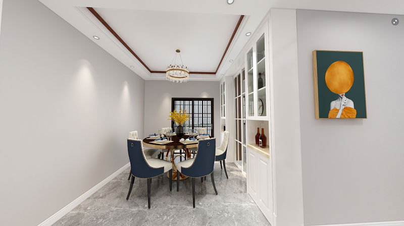 大理石台面,金属桌角的餐桌及绒面餐椅是餐厅空间的视觉重点,邀约三两好友一起吃吃喝喝,这套餐桌椅能够给主人带来面子,是业主高品位的体现。