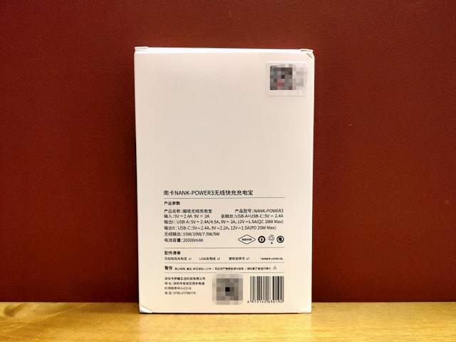 充电宝包装背面与正面都是带来了相同的设计元素,这里重点是列出了南卡无线充电宝POW3产品详细型号、生产厂牌、相关认证等信息。值得一提的是,该款充电宝依旧在右上方位置上带来了产品防伪的编号与二维码,完全是iPhone 12系列手机安全放心使用充电的质量保障。