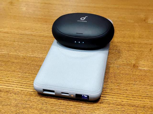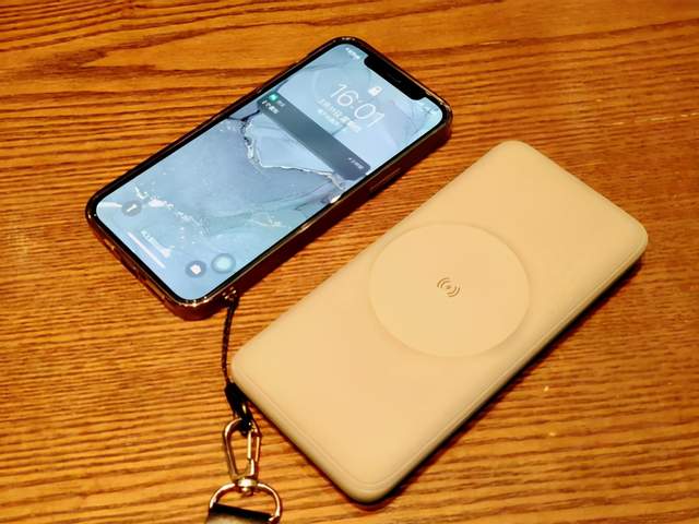 在无线充电方面,南卡无线充电宝POW3圆台式设计的无线充电位置,不仅带有苹果MagSafe磁吸充电设计,能满足iPhone 12系列手机的无线充电外,重点还符合无线充电的QI标准,能兼容三星、小米、华为等品牌手机的使用,而且实现长按开关后进入“低电流”模式,进行一些支持无线充电的TWS真无线蓝牙耳机充电使用。